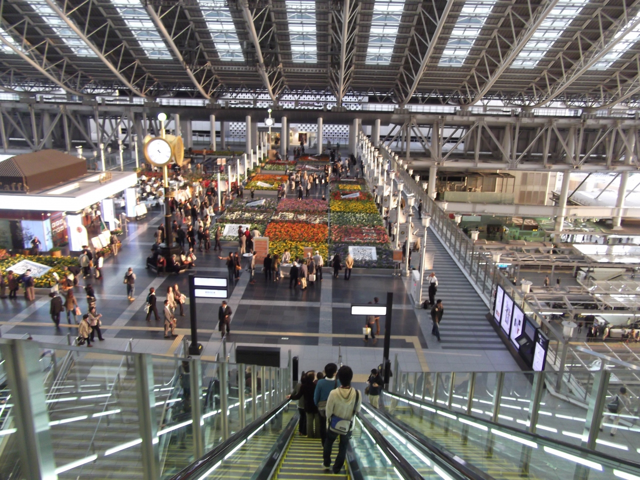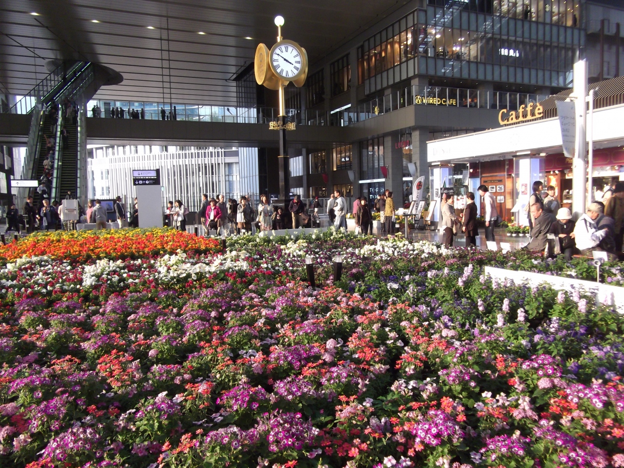 色とりどりの花が広場を埋め尽くして駅に癒しの空気を放っていました。