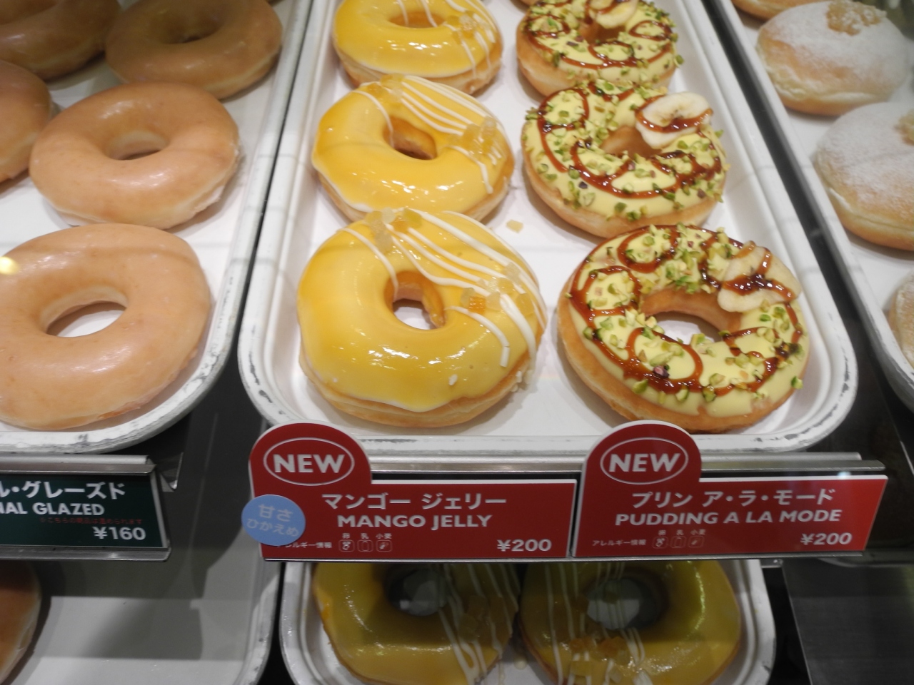 Krispy Kreme Doughnutsクリスピー・クリーム・ドーナツのマンゴージュリーですこれは、ミルキーなホワイトチョコのベースに、マンゴーピューレたっぷりの甘酸っぱいジェリーをのせてホワイトチョコラインの上にドライマンゴーのデコレーションしています。ぜひ、食べてみてください。