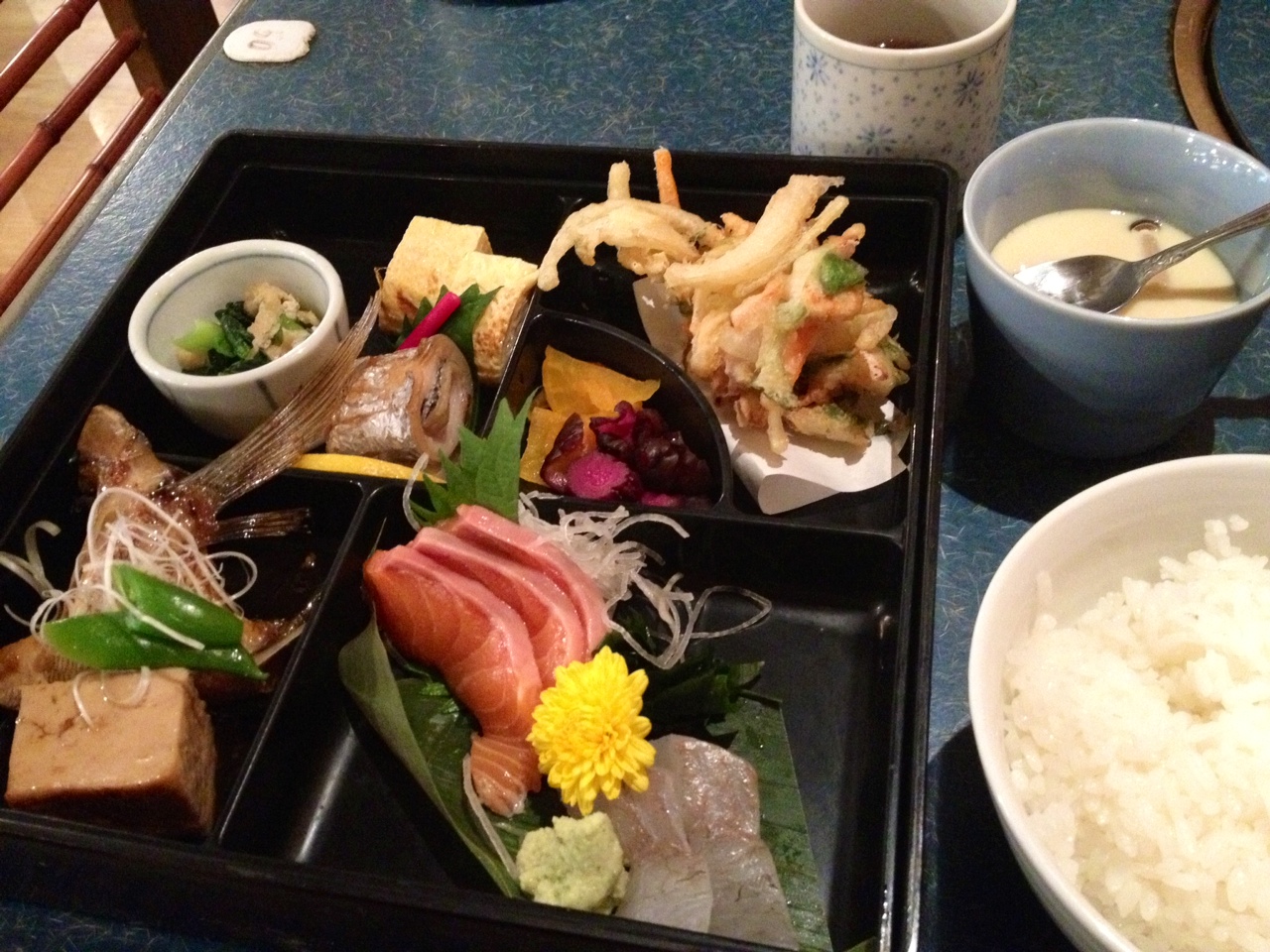 京阪守口市駅の高架下にある「鯛将丸」でランチをいただきました!暗い高架下にあっても、かなりインパクト大な看板でかなり目立つお店です。激安海鮮丼が有名なお店のようですが、「鯛将丸の豪華弁当」の文字に魅かれオーダーしてみました。お刺身、煮魚、かき揚げ、だし巻き、茶碗蒸し...と、結構なボリュームです。漁港酒場と称するだけあって、お刺身と煮魚がおいしかった。その他は、普通においしい感じです。