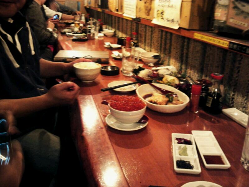 注文したのは刺身8品盛り合わせ(1580円)ぶどうえび(1尾980円)カキえもん(厚岸産牡蠣)ばばがれいの煮つけ、イカの沖漬ルイべ、げんげ(幻魚)のから揚げ。