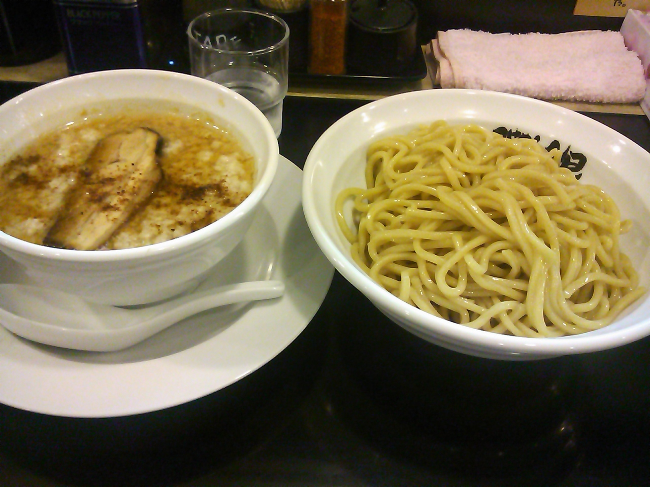 東武東上線の朝霞台駅からJR武蔵野線に沿って歩いていくと10分弱で着くお店です。平日の夜は並んでいる風景が良く見えましたが、最近(12年11月)は並ばなくても食べれます。お店に入ると自動販売機で食券を買います。背脂たっぷりは無料。お勧めはやっぱりつけめん。濃厚なスープと太麺がとても相性が良くておいしいです。