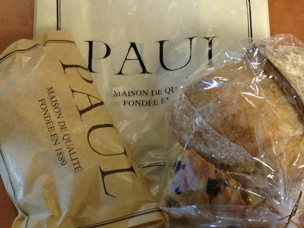パリの町中や、大きな駅、空港に行くと、必ず目にするブーランジェリー「PAUL」!キタでは、阪神百貨店の地下食料品売り場に入っています。1個1個の完成度が高くって、パリで食べるのと同じカリッカリのクロワッサンや、もっちりいちじくのパンがいただけます。とはいえ、お高いので、そうそう食べる訳にも行かず、今回は、パン5個入って525円という「お徳袋」が売り出されていたので、迷わずget!オリーブの入っているパンは、オリーブの香りとパンのモチモチ感が最高でした。ワインが欲しくなる感じです。ちなみに、PAULの横はワイン売り場です。