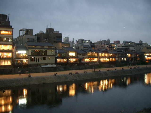 私は日没後に訪れたので、対岸の先斗町の料理店の灯りが川面に映えて美しい光景に遭遇しました。