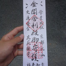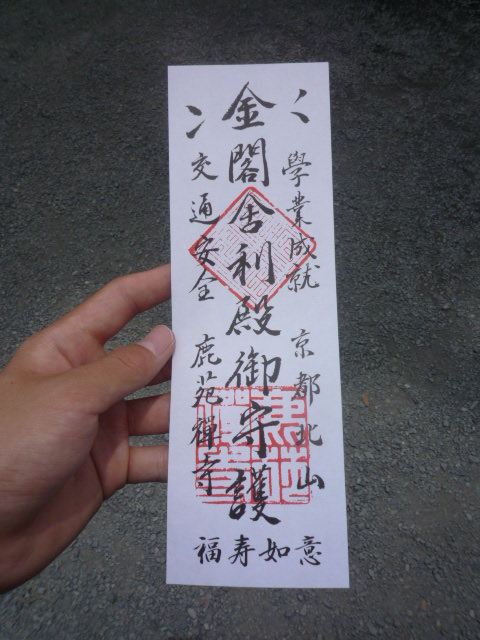 金閣寺(鹿苑寺)(きんかくじ ろくおんじ) で購入したお札です。とても効果が有るお札で、特に、学業成就や交通安全を祈願してのものです。子供の受験等で、ぜひ、行った際には購入して神棚に祀ってみては、如何ですか。