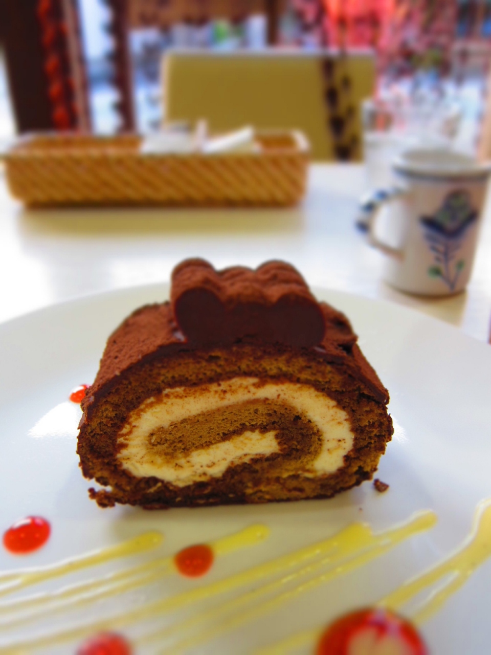 美濃市うだつのあがる街並みにあるカフェです。焼き菓子などの品揃えも多いし、ケーキ類もいっぱいありました。有名な街並みのついたロールケーキは濃厚チョコレートで作られたティラミスケーキです。お店の中で食べれて、かわいくデコしてくれるのでおいしく食べられます。見た目はさざえさんを彷彿とさせます。