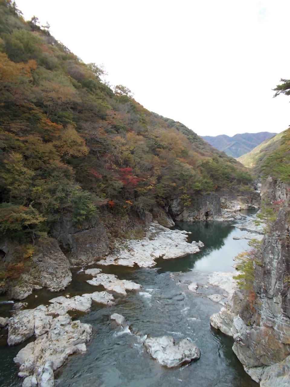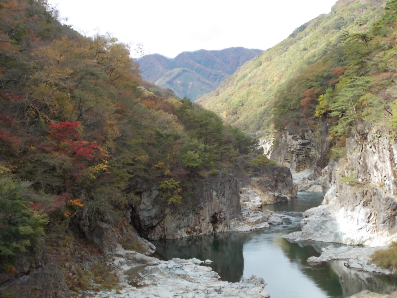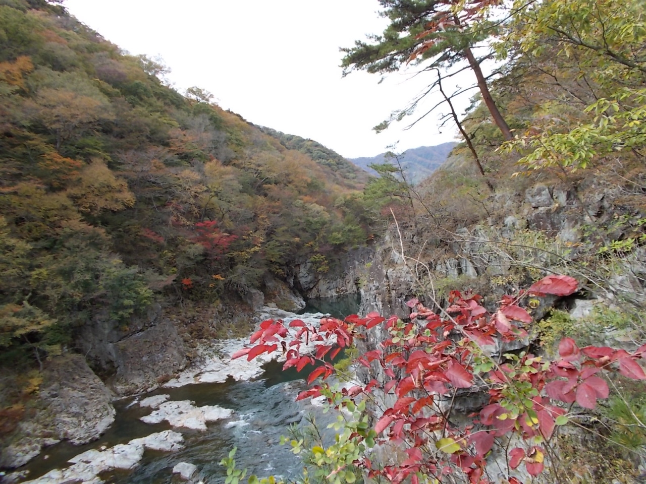 観光バスで龍王峡を訪ねる人も、ここまでは、必ず来ると思います。でも、結構階段があるので、疲れると思います。 時間があれば、ムササビ橋までは、いきたいものです。急な階段を考えれば、景観を眺めながらゆっくり歩けば、楽なものです。 結局最後は、急な階段を上るのですが。 紅葉の始まりの写真をuPします。