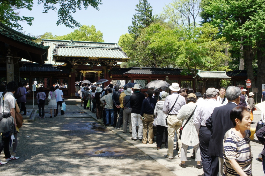 咲き誇るつつじは美しいけど、渋滞するほどの人の数には少々、戸惑っちゃいます。2012年5月に根津神社を初めて参拝した時のこと。つつじよりも、五代将軍徳川綱吉が1706年の大造営でつくった本殿、拝殿、唐門、楼門などが目当てだったのですが、とにかく境内を埋め尽くす人の数。お参りしようにも、唐門の下を通って長ーい列なのです。これじゃまるで初詣。もっとも、なぜ神社のお参りが一列に並ぶのかまったく理解できず、無視して勝手に参拝しましたけどね。訳のわからないルールが広まるのは困りものですな。50種3000株が咲き誇るつつじは、細い道を通りながら、左右のつつじを楽しむ趣向ですが、人の多さであちこちで渋滞。ちょっとイラっとしちゃうのは、人生の修行が足りないってことでしょうねえ。
