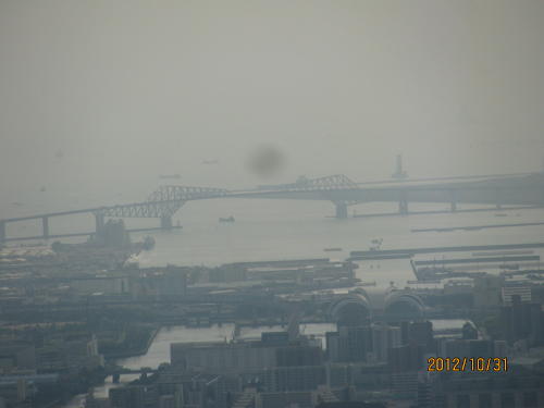 販売が止まります。なんとか一時間三十分程で下の展望台に着きました。ちょっと靄が架かってましたので遠くは霞んでいました。一周はあっと言う間に廻りました。見上げる程広くなかった。長い時間を掛けた割には見る物がありません。座れる場所は喫茶が一ヶ