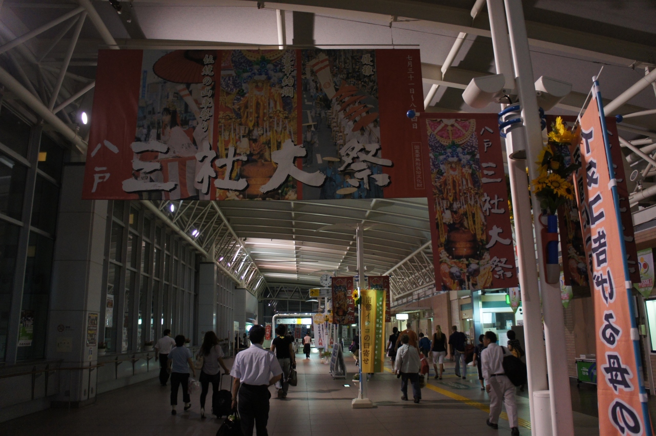 八戸駅は、新幹線の駅。八戸の街からは外れで、本八戸が八戸の市街の最寄り駅です。ただ、私は。、翌日から下北半島を回る予定だったので、ここから青い森鉄道に乗って、三沢のさらに先、上北町まで向かいました。乗り換えのために、一旦、改札を出たら、この横断幕。八戸三社大祭は、今日(8月4日)までだったんですね。盛岡のさんさ祭りもこの日までだったはず。東北は、この時期あちこちで大きな夏祭りが目白押し。そんな思いが強烈に湧いてしまいました。
