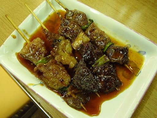 表に並んでいるホルモン、バラ、ミノ、レバーなどの串焼きを注文すると