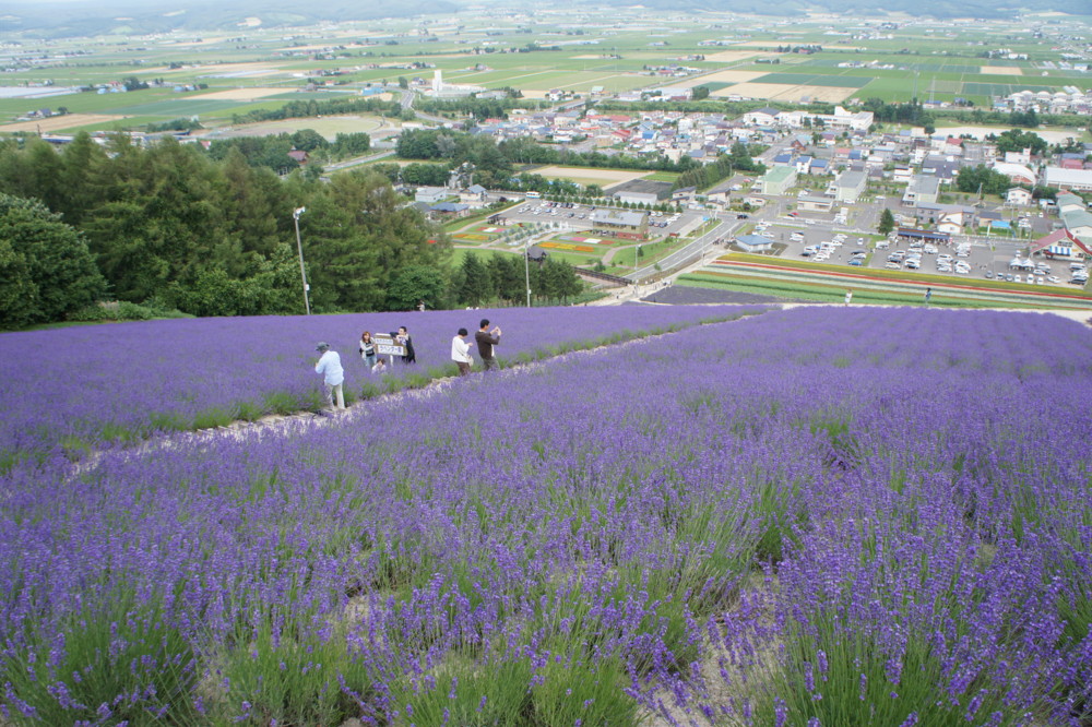 中富良野町の中心に走る国道沿いのスキー場の斜面にラベンダーが植えられている。下から見上げてももちろんきれいですが、ぜひとも山の上に登って見下ろしてほしいと思います。町も一望でき、手前にはラベンダーのじゅうたんが広がるようです