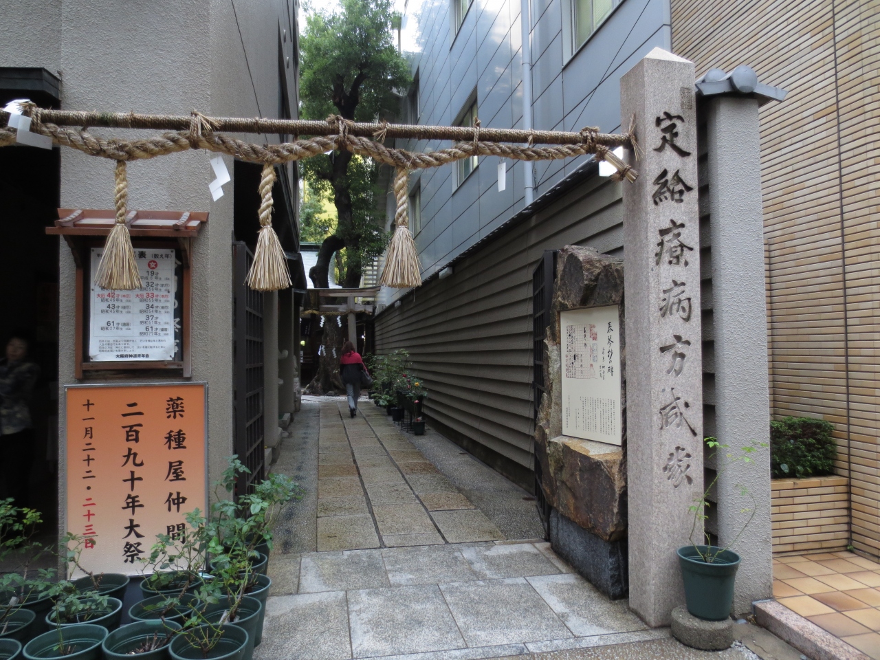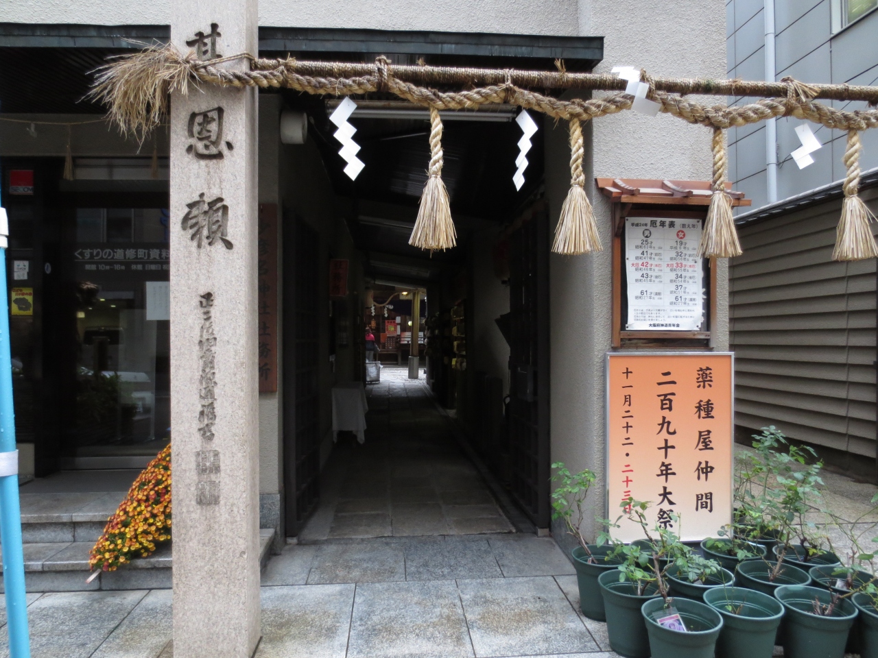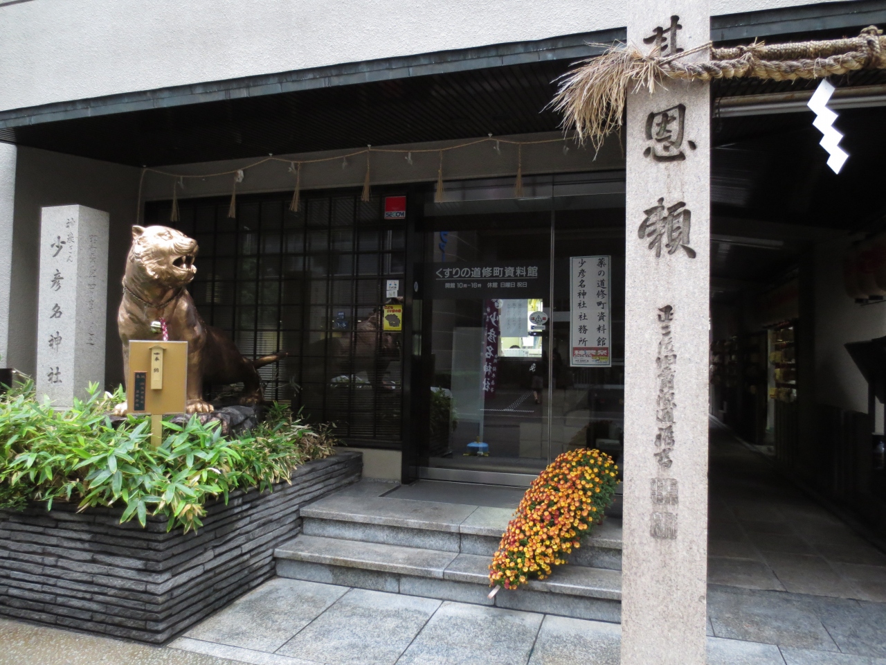 薬問屋の間にある小さな神社ですが、早朝から参拝する人がいて、暗くなっても参拝する人がいる神社です。少彦名命は、日本の薬祖神で、海から渡ってきて大国主命と一緒に国造りをした神様といわれています。この神社の神虎のお守りは、首が動きなんともかわいらしいです。すぐ隣に資料館もあり、この神社のことやお祭や薬問屋の町である道修町のことがよくわかります。大きさは小さいですが、神農さんと呼ばれ多くの人に親しまれ、信仰されている神社と思いました。夜暗くなってもお参りする人が絶えないということには本当に驚かされました。日常的に多くの方々がお参りするという感じがしました。また、11月の神農祭は大変なにぎわいのようです。