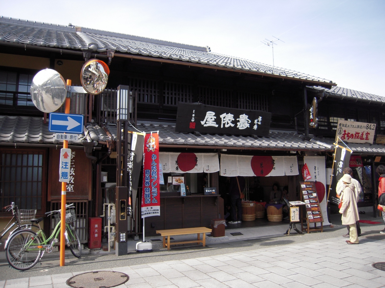 犬山城下町散策の人気スポットです。犬山は串グルメが人気らしく多くの店で串グルメをいただけますが、この店では醤油おこげ串が人気です。一本150円というお手頃価格で小さな焼きおにぎりが2個と漬物が串に刺されていました。