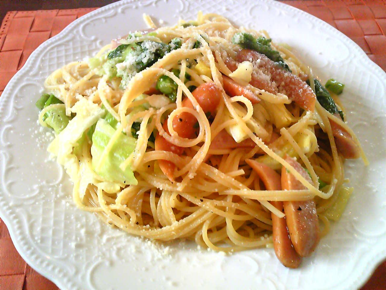 パスタ(キャベツ、ソーセージ、菜の花のアーリオ・オーリオ)(1050円)に+100円の追加でコーヒーをオーダーしました。サラダとパンが付きます。