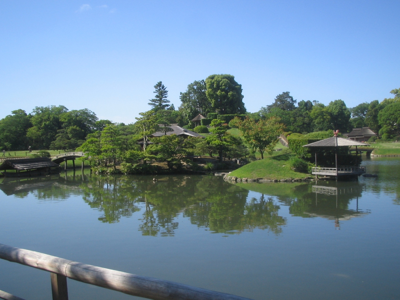 岡山後楽園の沢の池です。園内中央にある池で、左から島茶屋のある中の島、釣殿のある御野島等があります。中の島と御野島の間には、石標がありました。そんな歴史を感じさせる庭園です。ぜひ、一度は、行ってみてください。