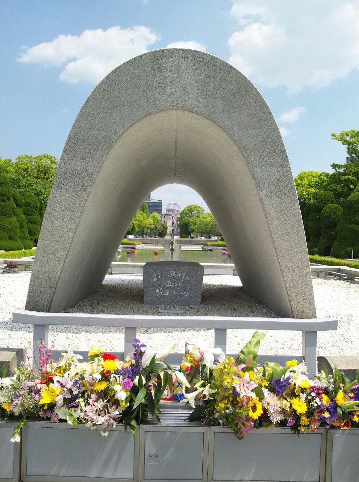 この原爆死没者慰霊碑の先に平和の灯があり、さらにその先には原爆ドームが見えます。だんだんと戦争の記憶が風化してしまわないよう、原爆や戦争の悲惨さを今一度学び、平和への誓いを新たにしようと思える場所です。