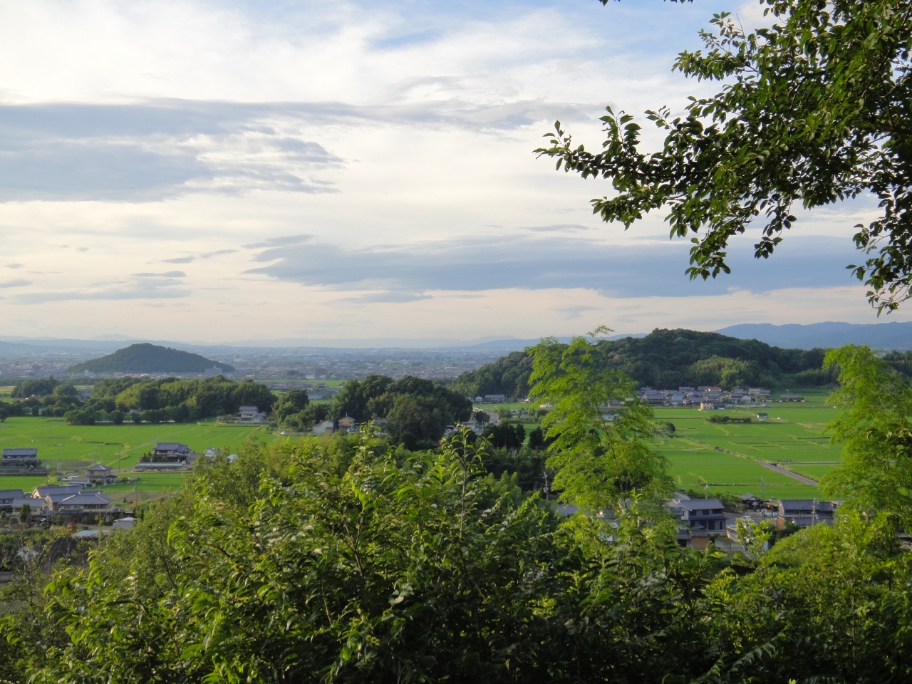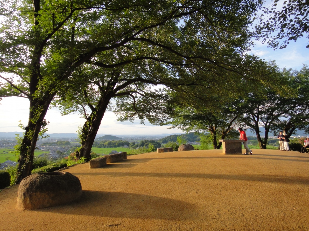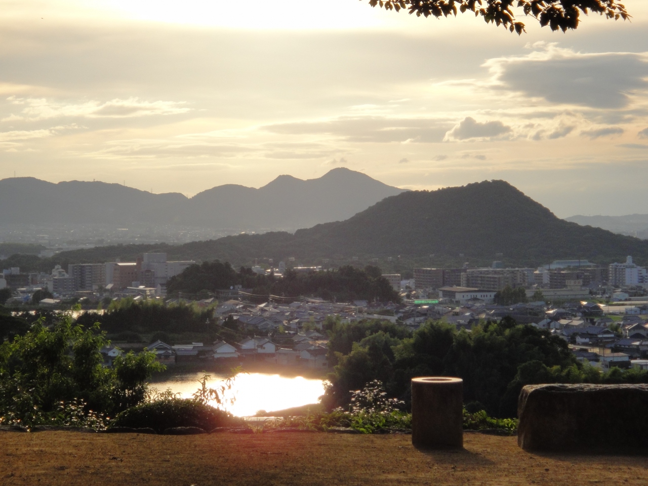 甘樫の丘山頂に着くと夕日が二上山の上空にかかり、夕焼けが美しい。何度来ても素晴らしい景色だと思う。剣池が光り、その向こうには畝傍山が、さらにその奥に二上山が臨める。