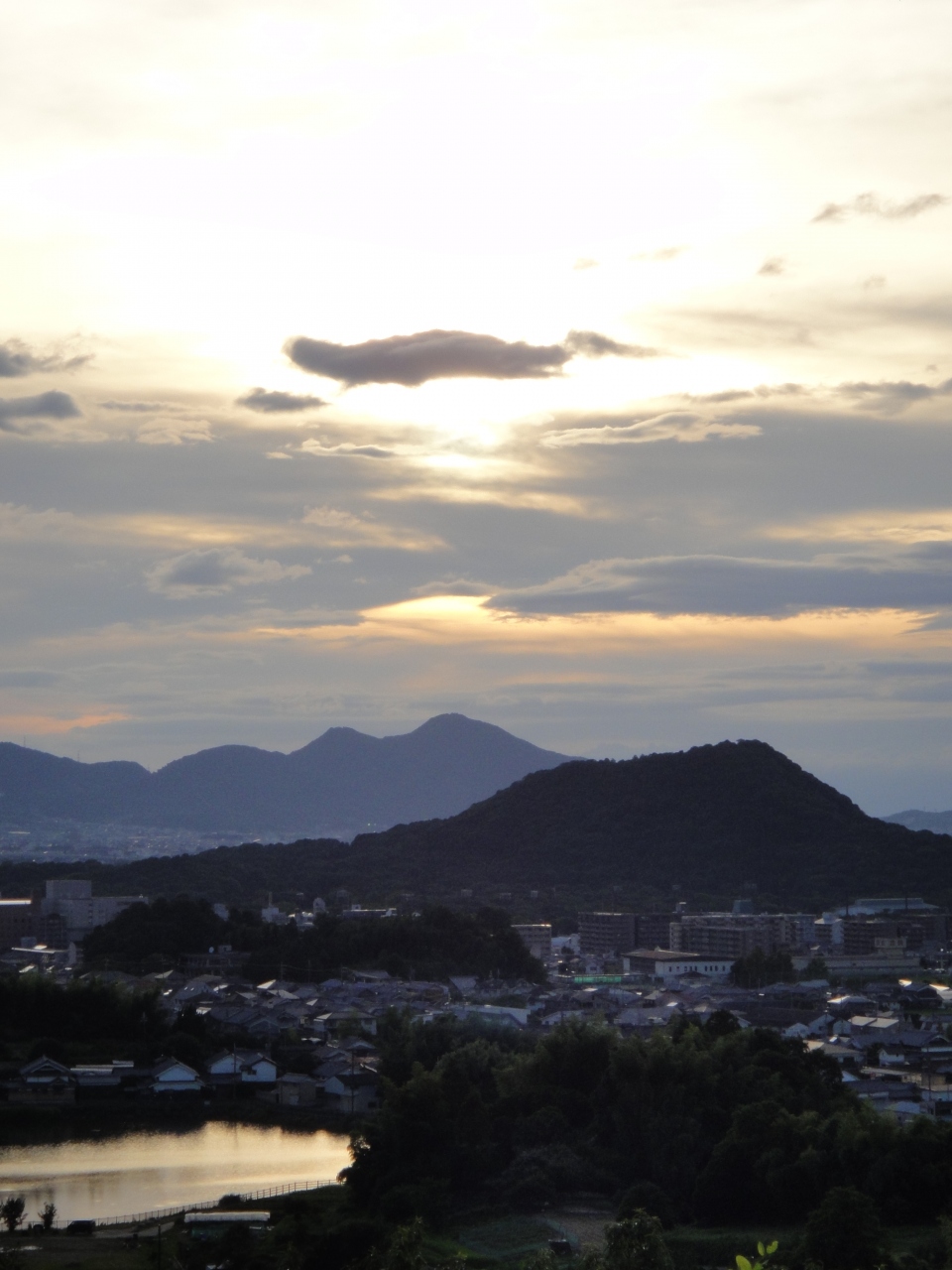 7月中旬夕方6時半、夕日が二上山に沈もうとしていた