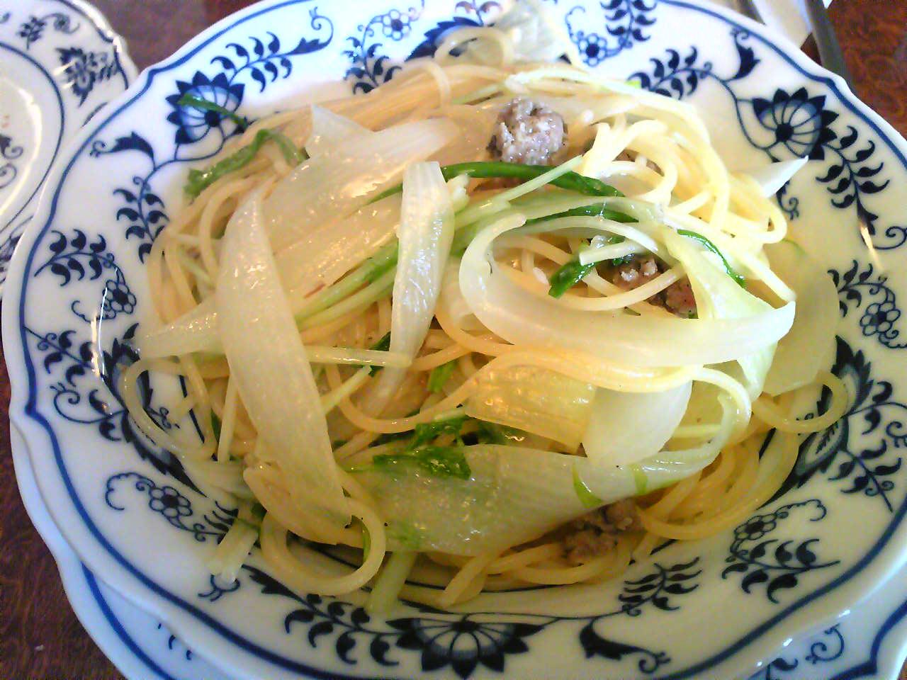 新玉ねぎと青菜とサルシッチャのパスタ+パン+ミニドルチェ+カフェで1000円。