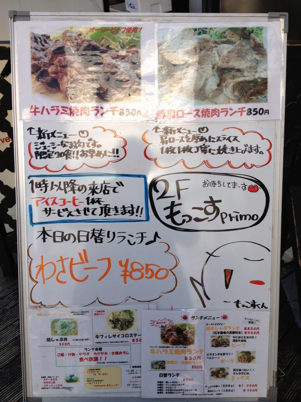 堂島にある「もっこすprimo」でランチをいただきました。限定20食というのに魅かれ「ハラミ牛焼肉ランチ」をオーダー。850円とはいえ、結構なボリュームです。肝心のお肉ですが、ちょっとスジがあって食べにくい部分もありましたが、最後までおいしくいただきました。コスパは高いと思います。