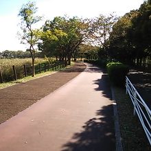 写真の左のコースがジョギングコース、真ん中が普通のアスファルト、右側がサイクリングコースです。