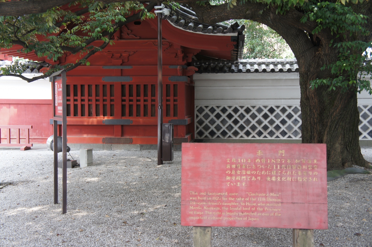 赤門は、東京大学キャンパスの本郷通りに面した西南部。すっかり東大を指すようになってしまいましたが、これは、旧加賀藩主前田家上屋敷の御守殿門。第12代藩主前田斉泰が将軍徳川家斉の第21女、溶姫を迎える際に造られた門です。前田家は外様なので、家康の孫である千姫の妹、珠姫以来、徳川からのお姫様を何代にも渡って迎えています。時代が下ってもそれが続いていたわけで、溶姫もその一人ですね。なお、造られたのは、江戸後期。建築様式は薬医門というらしいですが、よく見ると意外にシンプル。切妻造に、左右が唐破風造の番所があるのですが、なまこ塀とあわせて見て、その威厳が保たれているように思います。国の重要文化財。