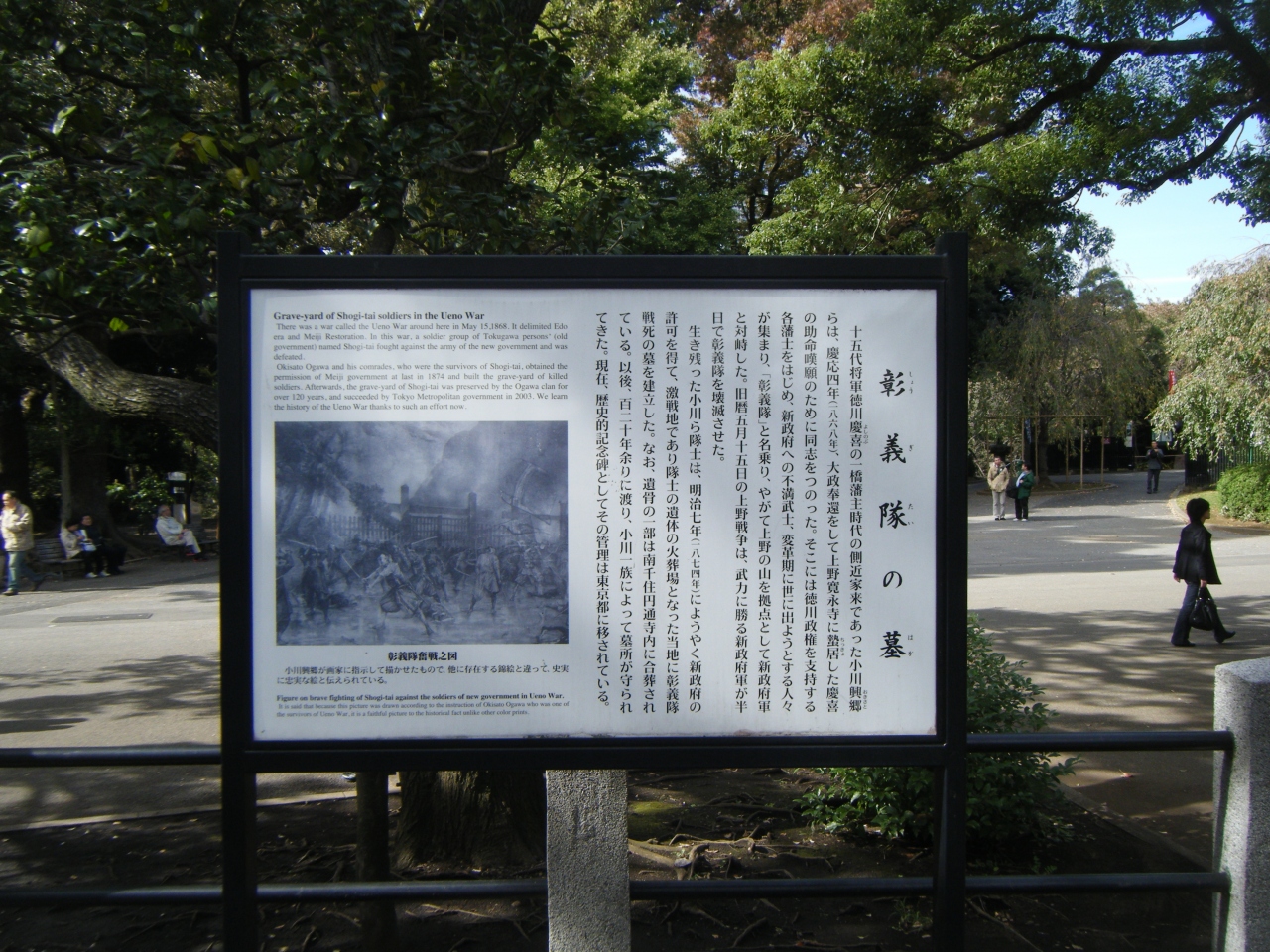 彰義隊(しょうぎたい)のお墓をお参りしましたので報告致します。この部隊は、1868年に江戸幕府の征夷大将軍であった徳川慶喜の警護 などを目的として渋沢成一郎や天野八郎らによって結成された部隊。幕府より江戸市中 取締の任を受け江戸の治安維持を行ったが、上野戦争で新政府軍に敗れ解散した。