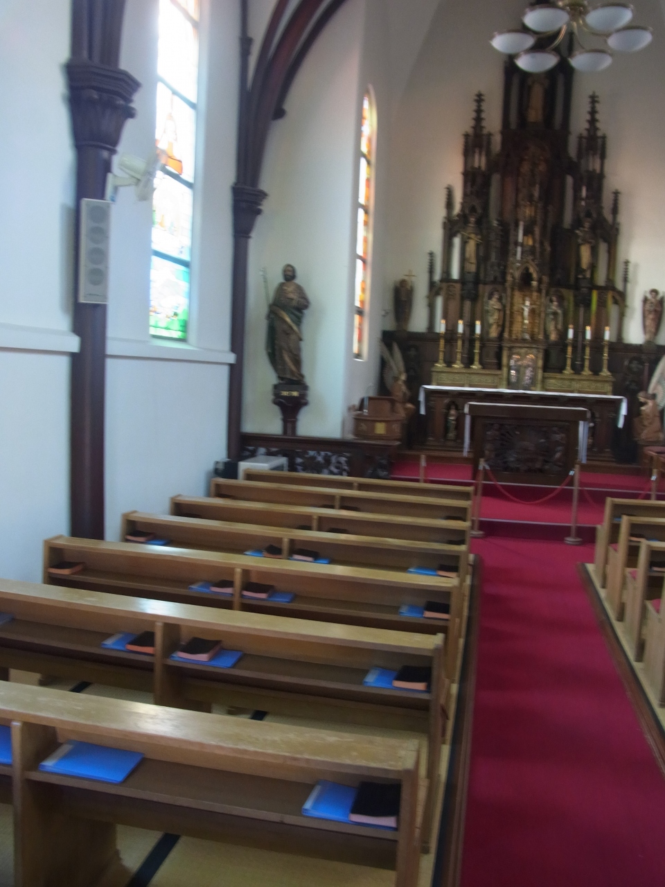 ステンドグラスには旧約聖書の世界が描かれていて、ゴシック様式の祭壇は高さ8メートルもある。驚いたのは一部の床に畳が敷かれていたこと。和洋折衷の様式がここにもあった。築100年以上になる伝統のある聖堂。