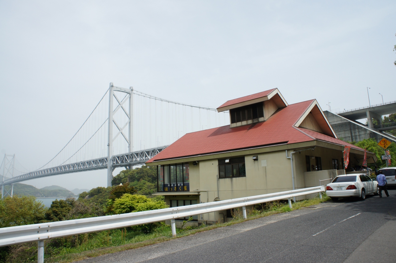 因島大橋は、向島と因島を結んでいる橋。向島と因島の間は、布刈(めかり)瀬戸といって、主要航路になっていて、大型の船も行き交います。全長は、1,270m。建設当時は、日本最長の吊り橋だったようです。海面からの高さは、50m。ここも、他のしまなみ海道の橋と同じように、歩行者・自転車専用の道路があります。自転車は、50円ですが、歩行者は無料。実際に渡る人だけでなく、ただ見るだけの人も多いようで、橋に向かう人は意外に大勢。写真は、因島側の橋のたもと。はっさく屋から橋を眺めたものです。