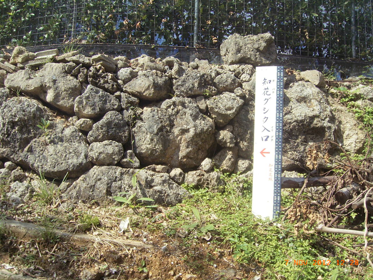 沖縄市からバスで10分程度です。バス停からは左前方の木々でおおわれた小高い丘しか見えません。そこが知花城址です。近づくと標識がでています。その標識近くの民家の石垣と石門が城址のようです。標識に従って登って行っても城壁などもありません。