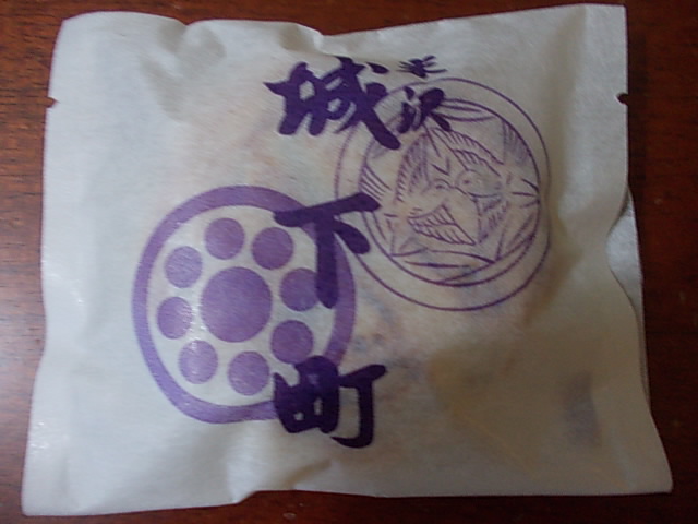 ここのお菓子屋さんは、米沢を代表する店の一つですが、中でも有名なのがこの「城下町」という銘菓です。城下町米沢を家紋の絵柄のパイ生地で表現し、中にはナッツ類を小豆餡でコーティングした独特の香ばしさが魅力のお菓子でした。尚、価格は一つ110円となっています。