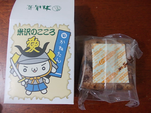 このお店は、町が輩出し、数年前の大河ドラマ「天地人」でも有名になった直江兼続をあしらったキャラクター、”かねたん”をデザインしたユニークなお菓子を発売していることで有名です。米沢おばこ、という小箱に入った銘菓ですが、チョコレートテイストのプチケーキになっていて、中身もとても美味しかったです。