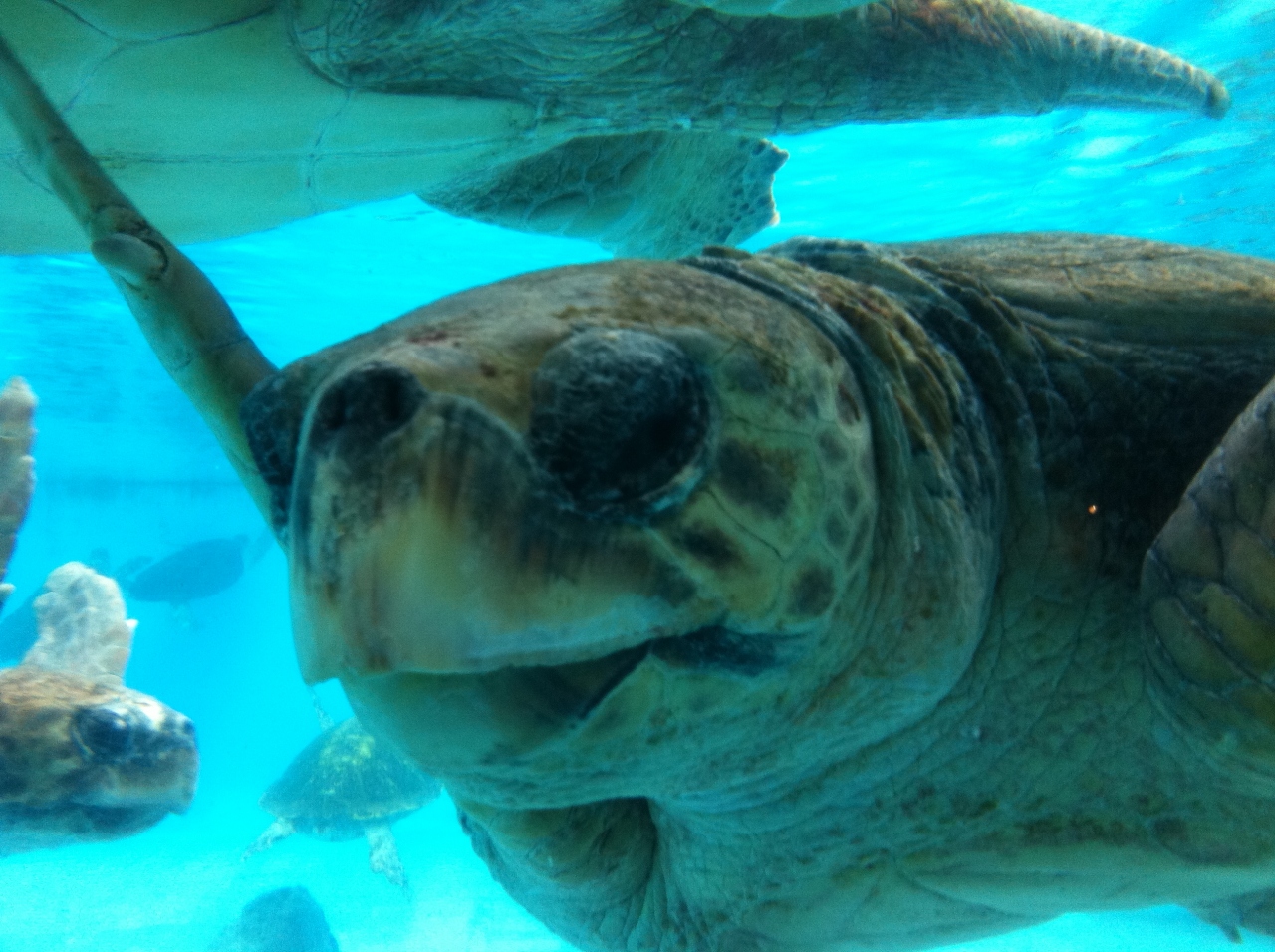 那覇市内のホテルを朝早くレンタカーに乗って出発。高速道路に乗って向かうこと約1時間。前もって市内で購入した割引入場券で入場。水槽は圧倒的な大きさでジンベイザメが悠々と泳ぐなど迫力満点です。それと同等に楽しめたのが外のウミガメ館。カメっていつも甲羅干ししている印象だったのですが、無表情ながらもそれぞれ微妙に異なる顔のウミガメがうじゃうじゃと泳いでます。