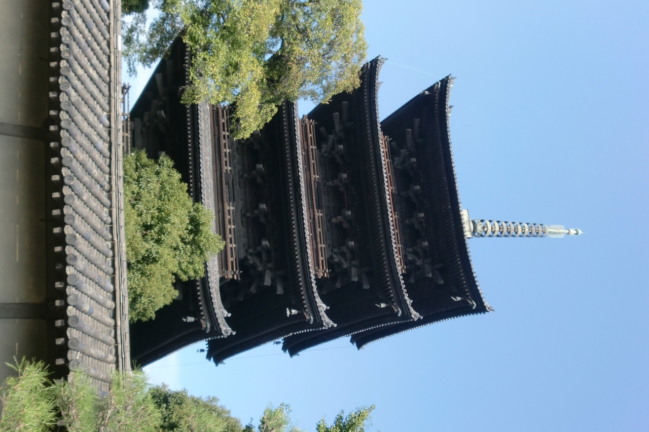 京都駅から近鉄京都線で一駅目の東寺駅下車、西へ徒歩約10分。新幹線からでもよく見える五重塔は高さ約57mもあるそうです。つい巨大な五重塔(国宝)へ目がいってしまいますが、五重塔以外にも金堂や大師堂も国宝で、その中には国宝や重要文化財の仏像が多く安置されています。こちらも見応え十分あります。