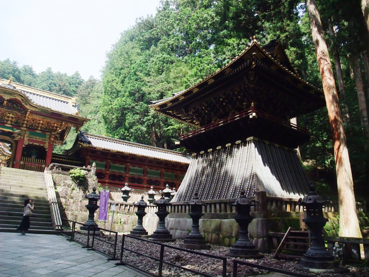 夜叉門の石段下には、鼓楼と鐘楼があります。鼓楼、鐘楼の周辺には、10万石以上の諸大名から奉納された唐銅の灯籠が、33対(66基)あります。