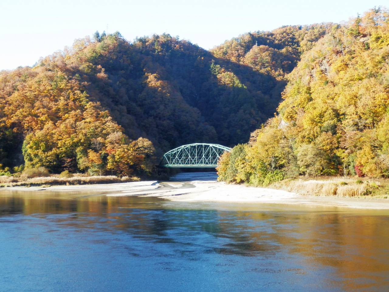 ここは秘境駅というよりも絶景の駅ですね。天竜橋から駅方面、および対岸の鉄橋、囲む山々と雄大な天竜川、さらに線路に囲まれた景色はパノラマビュー・ワイドビューといったところです。川はほとんど流れもなく静かでした。