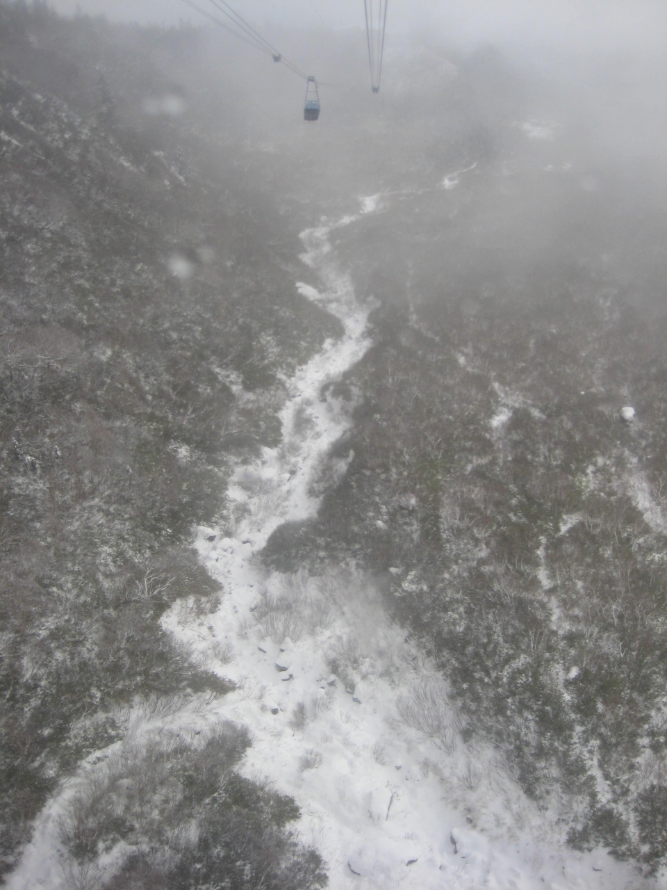 延長1700メートル、高低差500メートルで、途中に支柱が1本もないワンスパン方式として日本最長で7分20秒かかる。