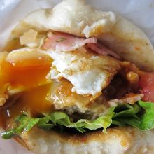 肉汁ジュワーンな肉厚ハンバーグが入ったハンバーガー。