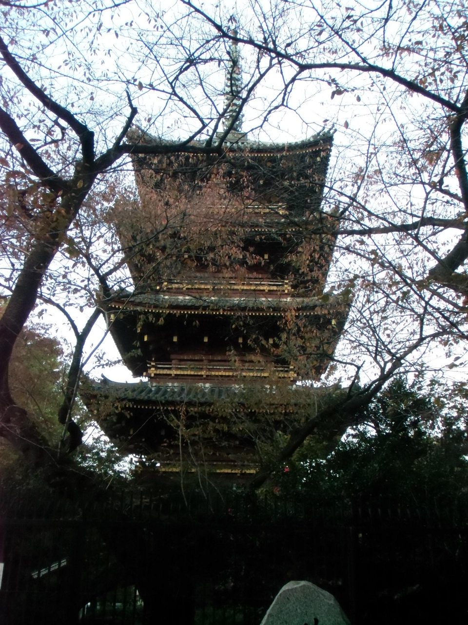 上野動物園の横にある旧寛永寺の五重塔。高さ36mありますが、木々に遮られて近くまで行かないと見えません。一度焼失されたため、寛永十六年(1639)に再建されました。) 塔の構造は三観五重塔、五重銅瓦葺からなっています。[