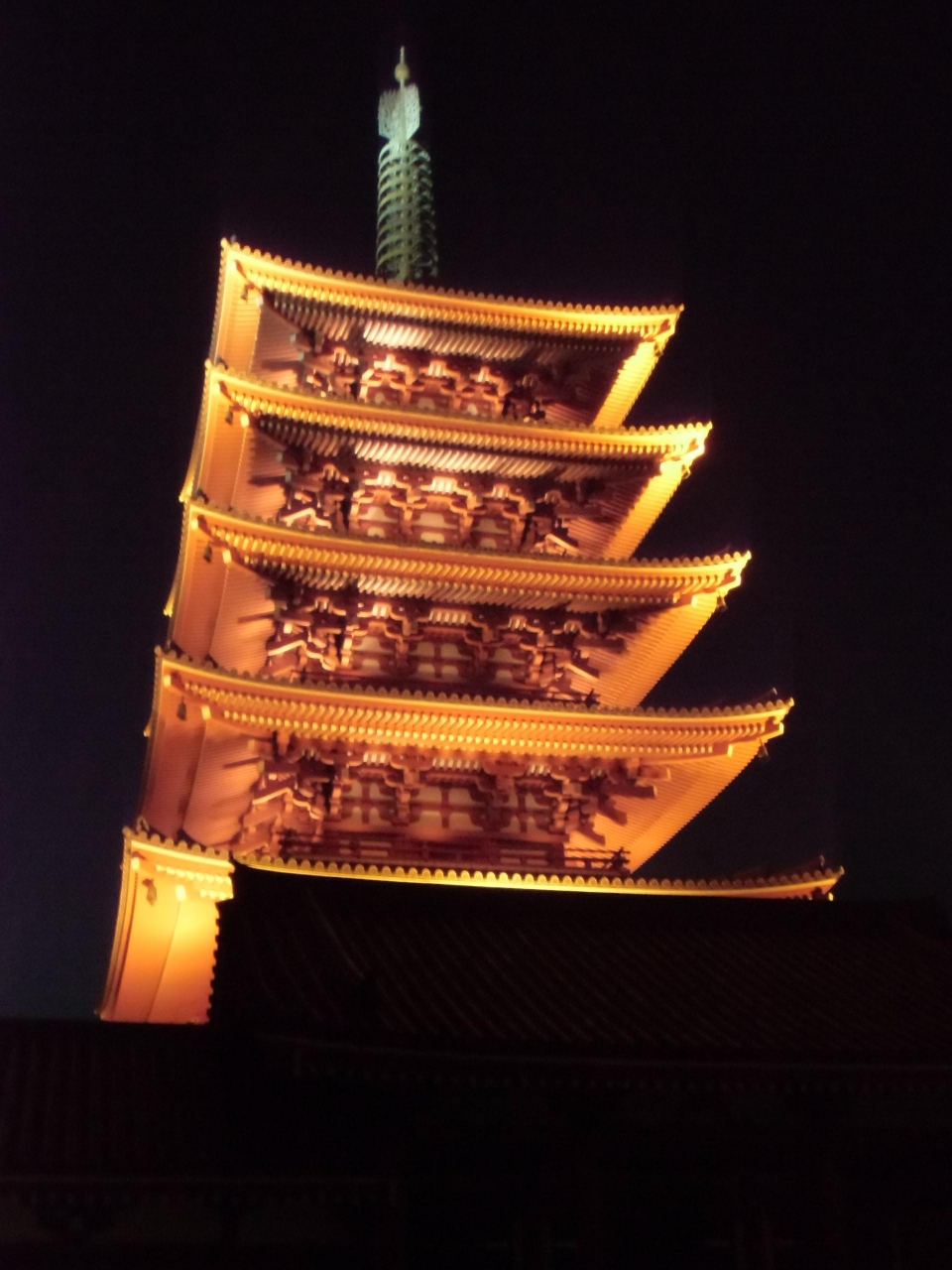 雷門、仲見世、宝蔵門を過ぎると、左手には五重塔、右手にはスカイツリーが見えます。暗くなってから行くと、それぞれがライトアップされていて、昼間とは違った美しさがあります。暗くなってからの輝く浅草寺が個人的にはお勧めです。