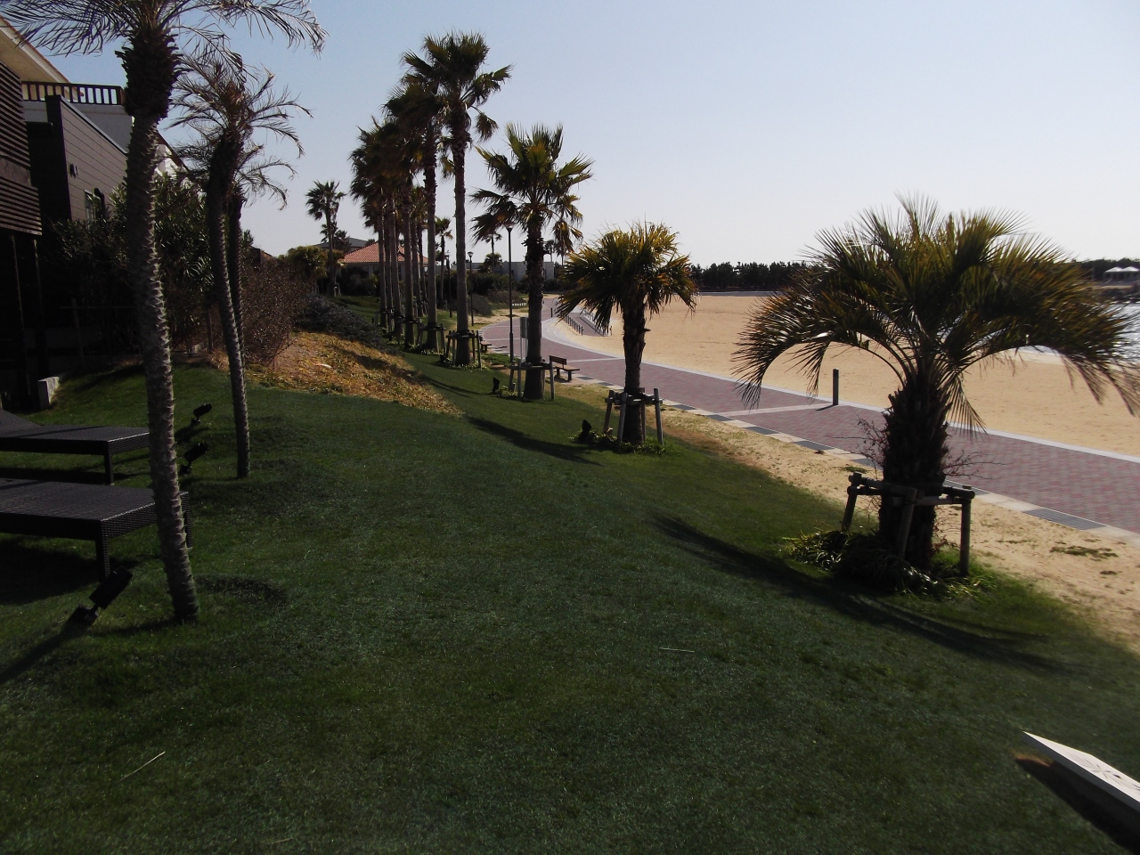 施設前一体にパームツリー?が植えられ、海岸の散歩も楽しめて