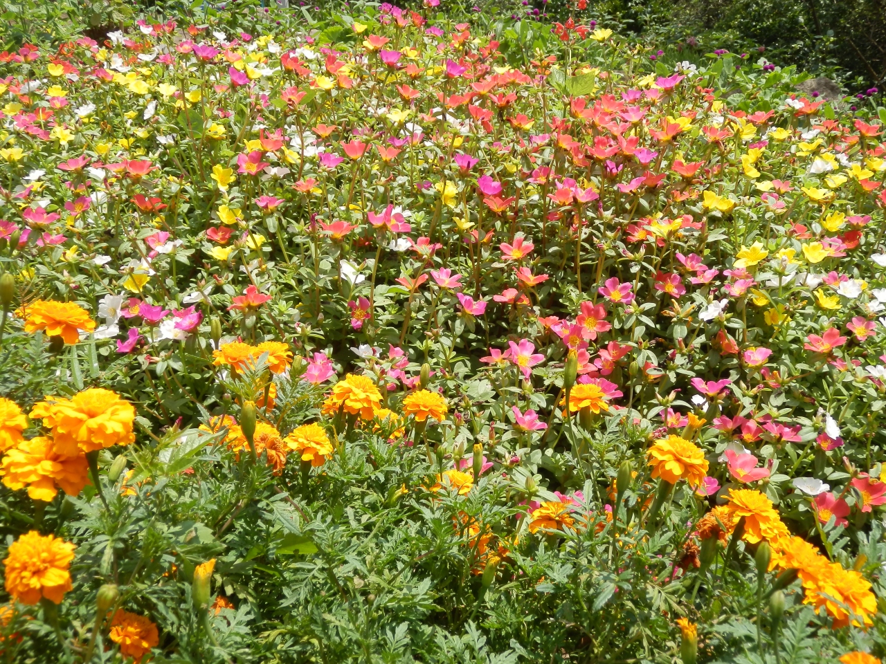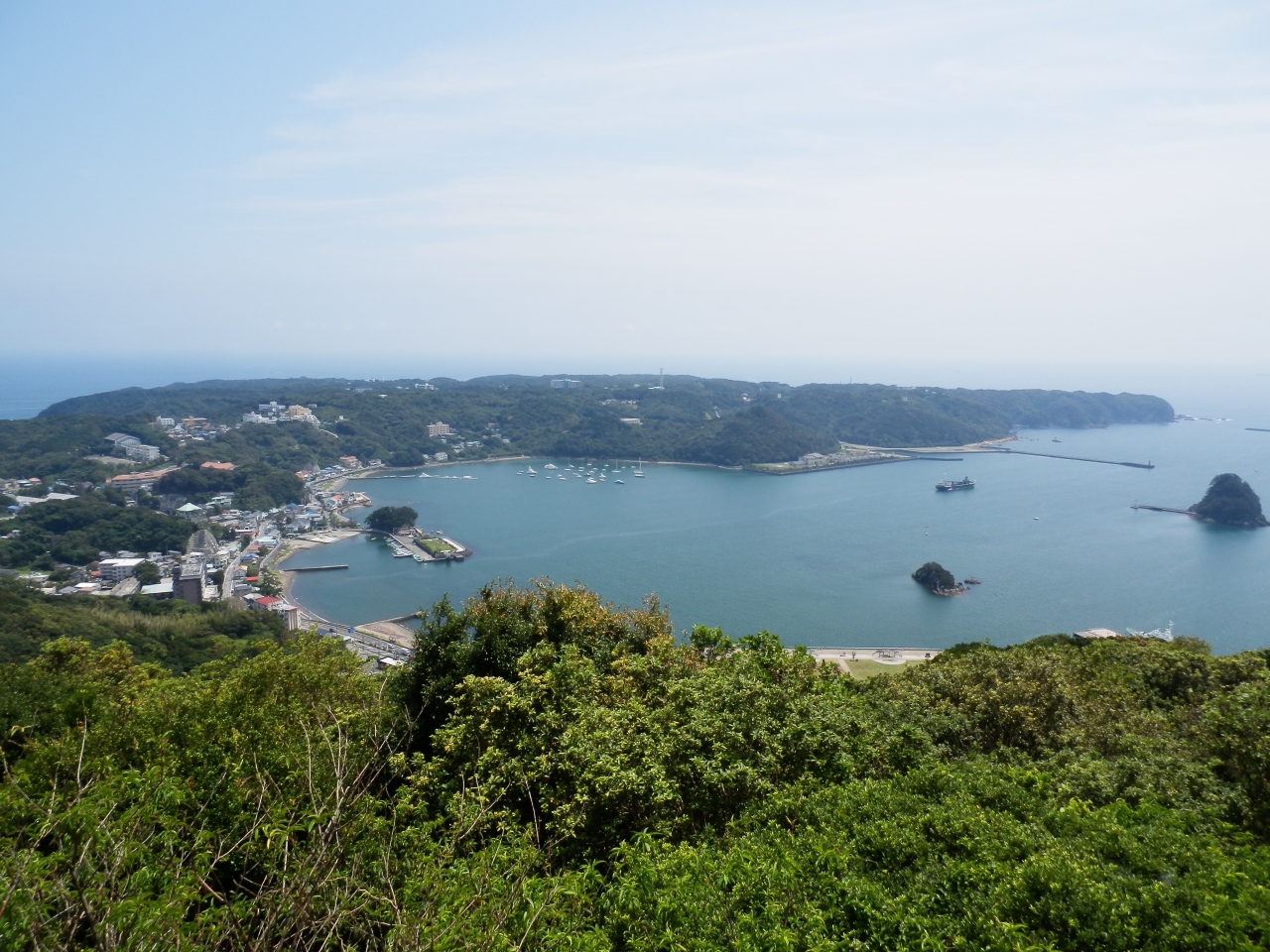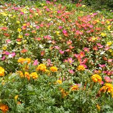 快晴の空の青、山の緑、海の青、赤や黄の花々