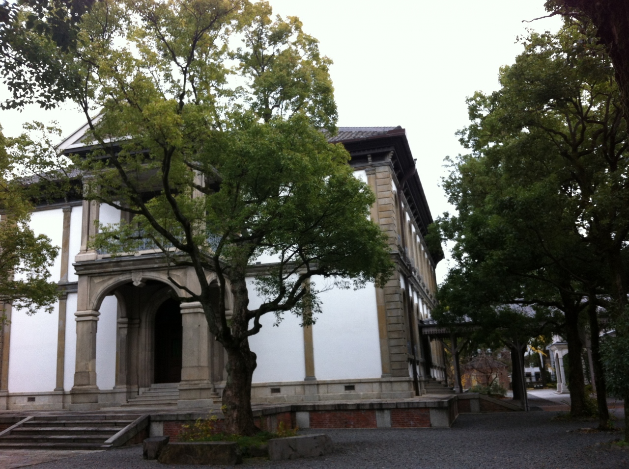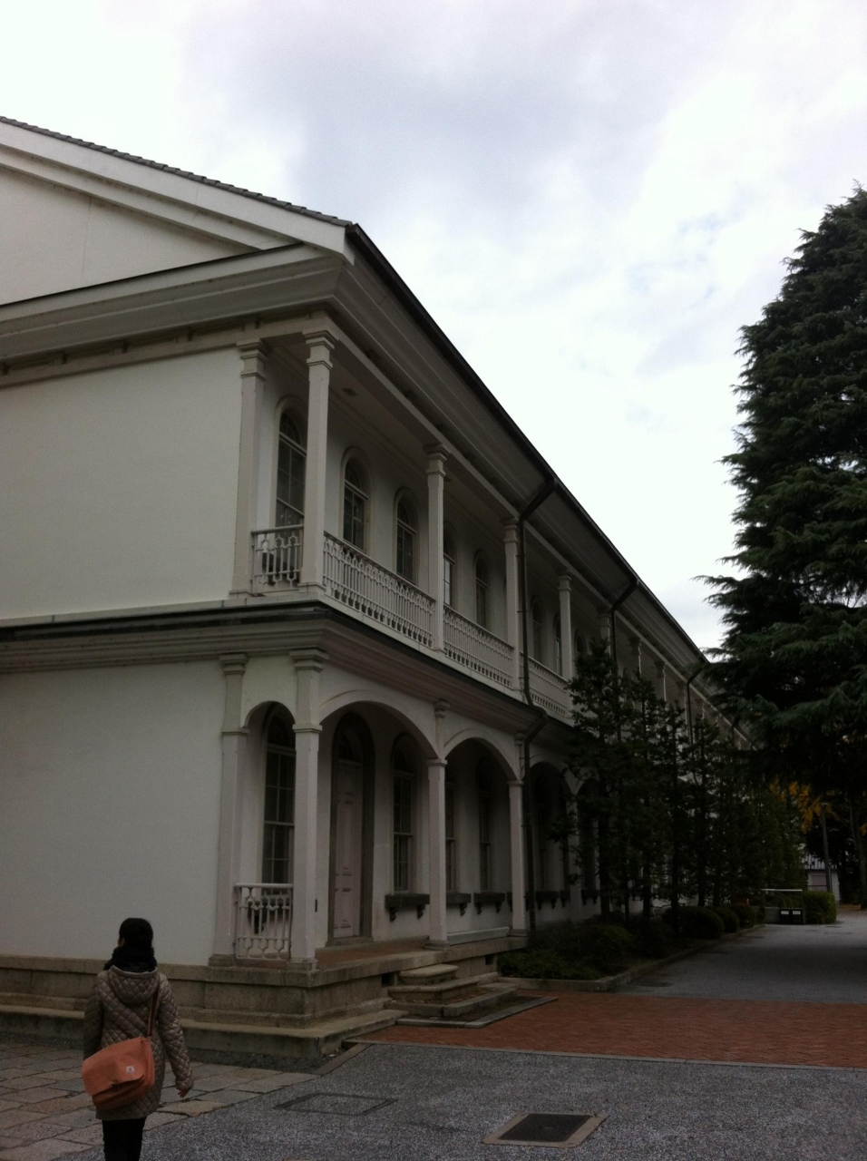 休みの日ということもあって人影もまばらな敷地内に佇む学舎は、洋館と言っても、明治大正期の重厚な石造りの建築とは趣が違います。私が感じたのは、シンガポールやマカオなどの南国の植民地に西欧諸国が建てた建物のような、なんとも言えないオリエンタルかつノスタルジックな雰囲気。あとで調べて知ったのですが、この建物は「擬洋風建築」といわれ、石造りに見えるものの、実際には木造建築物に石材を柱などの木部に貼り付けられている「木造石貼り」であるとのこと。あの時感じたコロニアルな雰囲気は、このあたりに理由があったようです。学生さんが居ない休みの日なら、人も少なく休息がてらにのんびり見学できると思います。