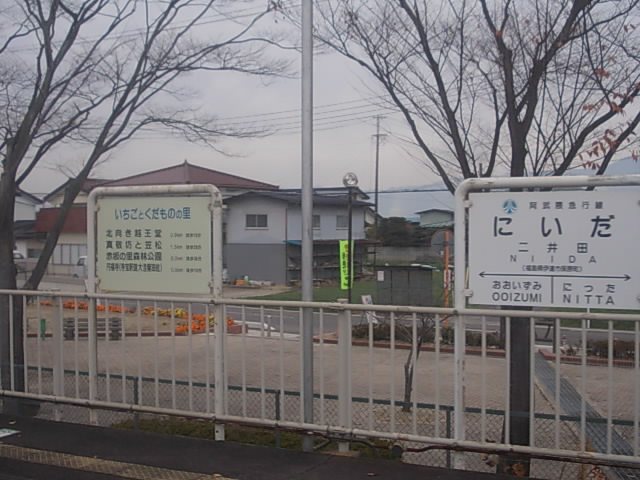 隣の新田駅と発音的に間違えやすい駅ですが、雰囲気もちょっと似ていて、駅舎がなくホーム上に屋根だけの待合室がある小さな駅となっています。付近には果樹園が広がっていて、この辺りの典型的な風景を楽しめる駅周辺となっています。