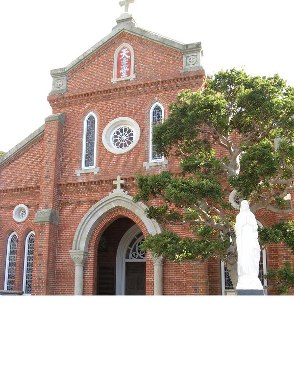 有川港から車で約15分、国指定重要文化財の「青砂ヶ浦天主堂」は、小高い場所から奈摩湾を見下ろすように正面を西に向けて建っています。青砂ヶ浦教会は、明治11年(1878年)に同地区のキリシタンたちにより聖堂がつくられ、その後、一度改築を経て、明治43年(1910年)に3代目となる現在の煉瓦造り教会が教会建築の名工・鉄川与助により建築されました。