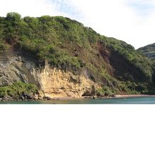 赤色ぽい層と黄色ぽい層の上下二つの層からなる断崖
