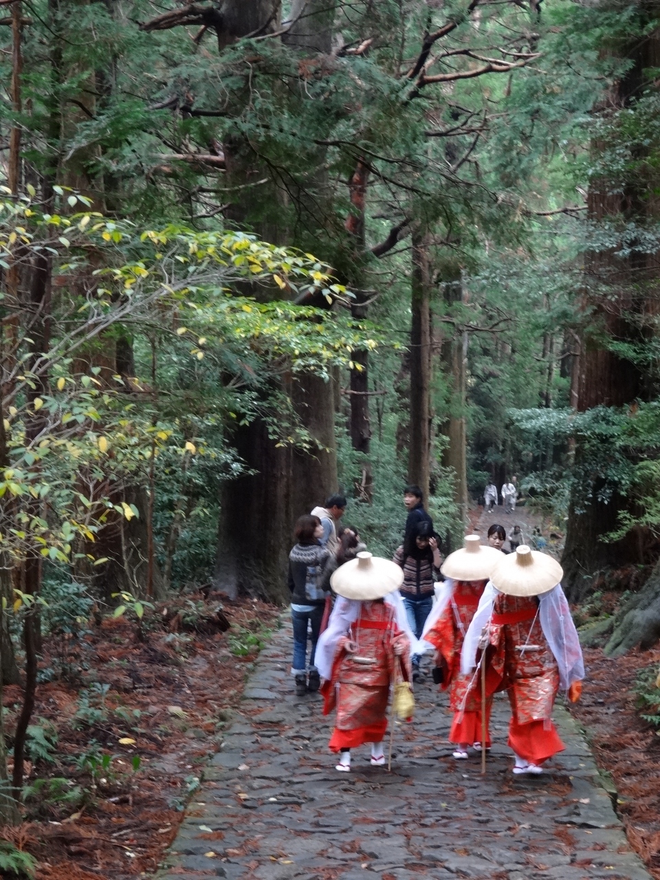 小雨振る中、熊野那智大社まで趣のある石畳を30分ほど歩きます。もちろん上り坂ですが、そんなに急ではないので、平安装束の皆さんも余裕?で歩いてらっしゃいました。