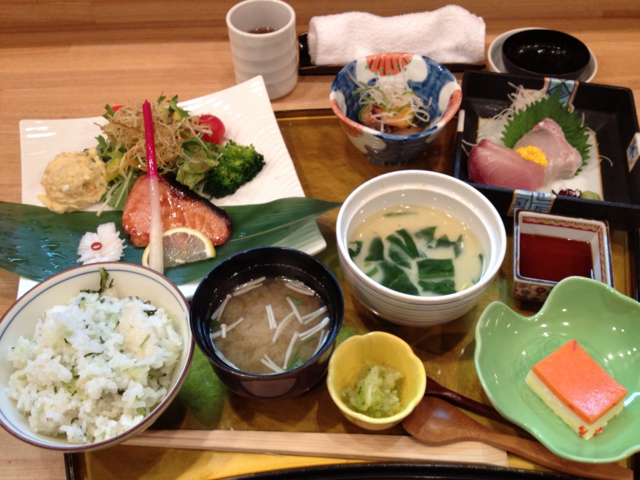 お刺身、魚と野菜の南蛮漬け、牡蠣の茶わん蒸し(お餅が下に敷かれててびっくり)、サラダ、ぶりの照り焼き、蟹とみぶなのご飯、お味噌汁、デザートにパプリカの2色ムースと盛りだくさんの内容で大満足でした。