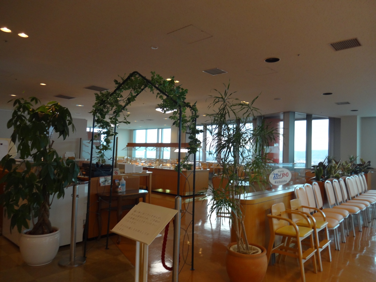 眺めはいいですよ(^−^)なんか広い場所にフロアを区切ってありますが、飾りけはないかな(-。-)y-゜゜゜ムードを楽しむ感じではないですが、高いところでバイキングをお手軽にという感じです。
