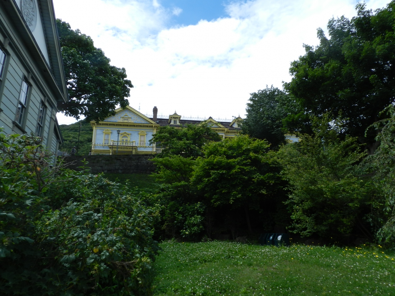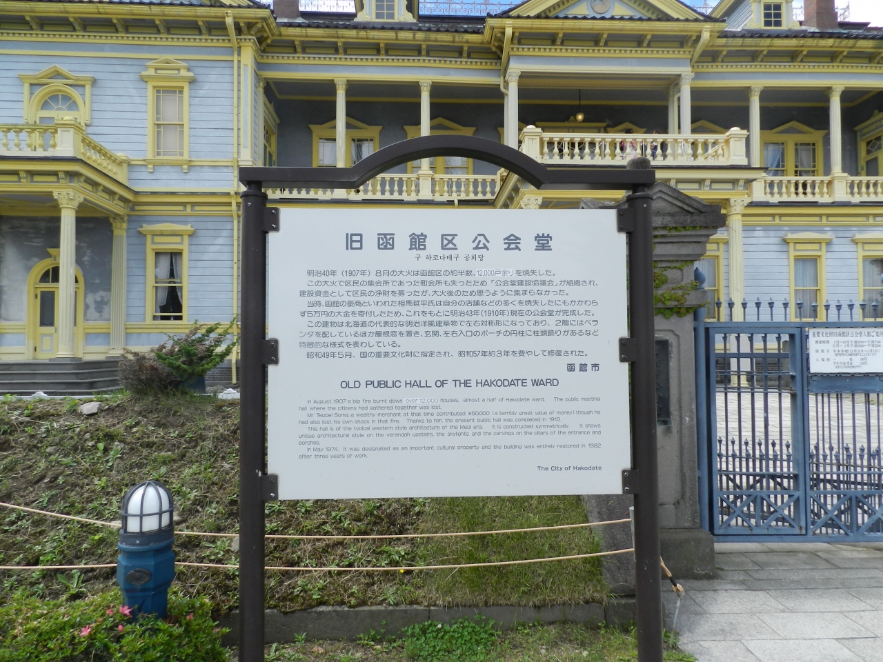 基坂を上り切った突き当りに元町公園があり、その公園を抜けるとブルーグレーとイエローの色が特徴的な美しい建物『旧函館区公会堂』を見ることができます。